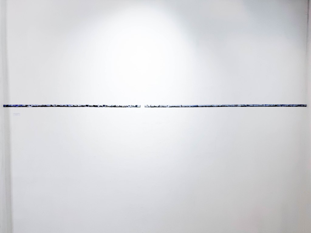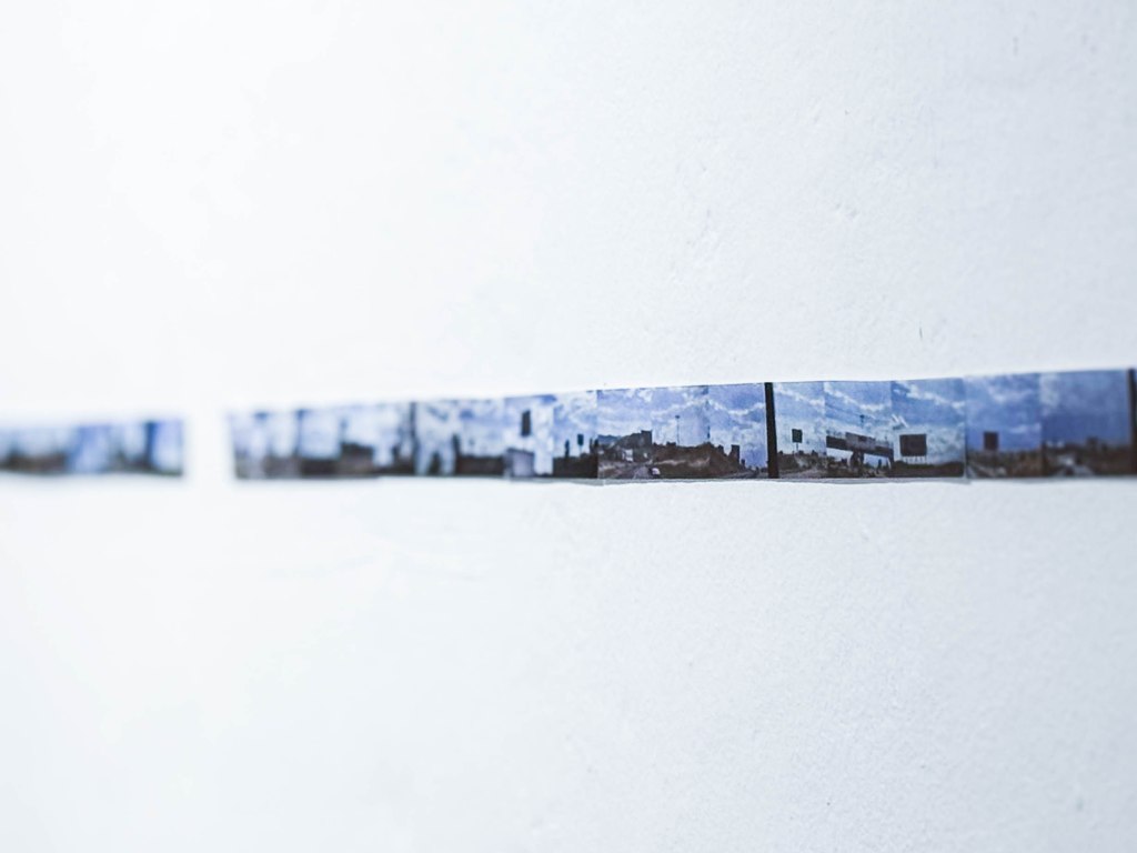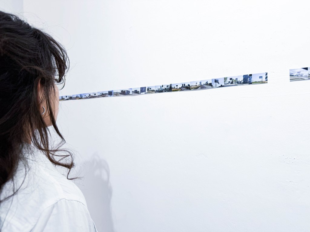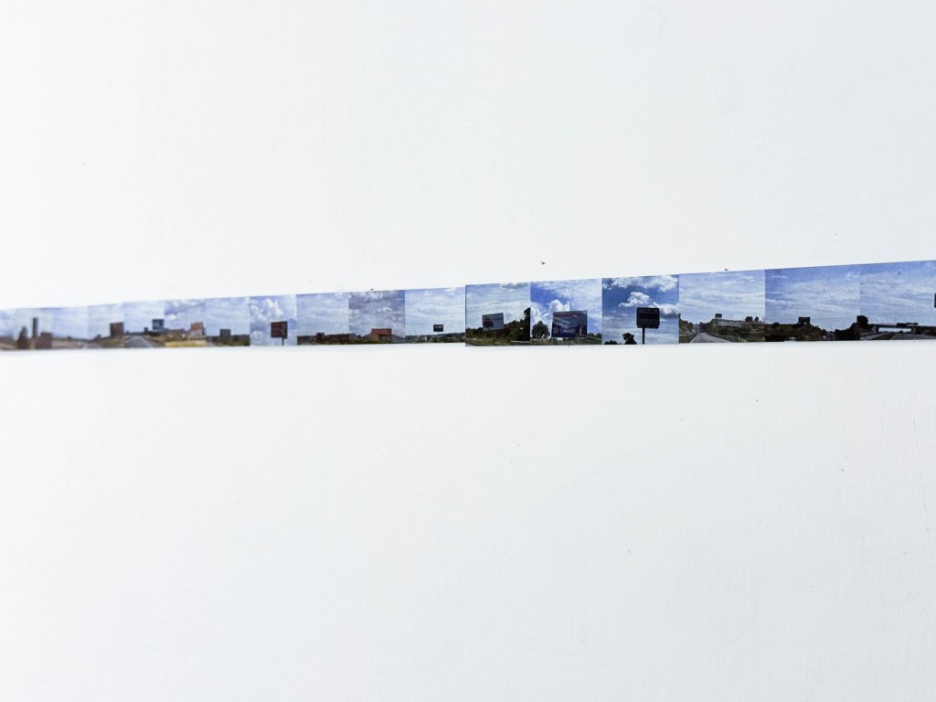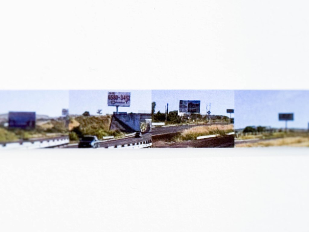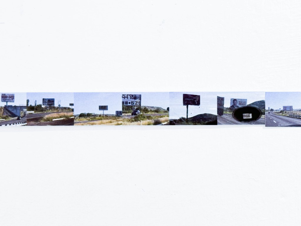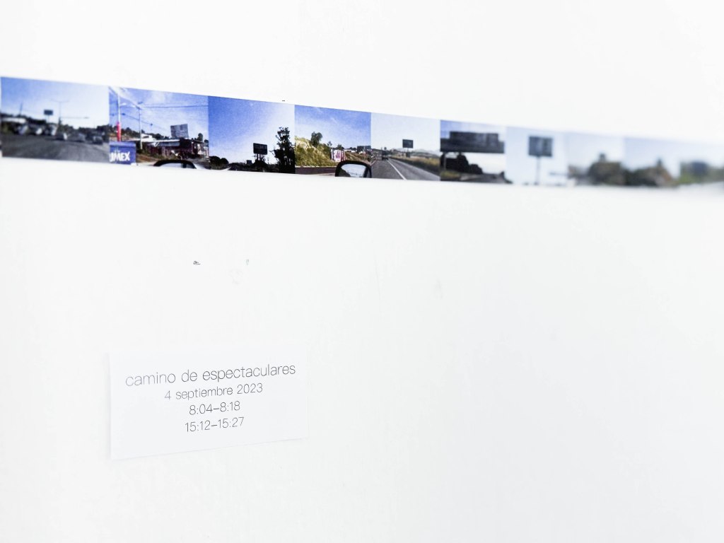 A partir de las fotografías tomadas de los espectaculares encontrados por el camino cotidiano (2023), se decidió intervenir una pared con pequeñas fotografías dispuestas de manera continua, en forma lineal y cortando la mirada; se dispusieron en el espacio de la «Luz de la Nevera», en la Universidad de las Américas Puebla, en el marco de la «Apertura de procesos de un hacer artístico (desde el transitar cotidiano)». Se dispuso de esta forma pensando en la misma linealidad del camino, del sentir del trayecto en el tránsito diario que llega a resultar monótono, lineal, regular. Sin embargo, se busca enfatizar que dentro de esta misma linealidad hay una constante repetitiva y continua, que a veces cambia pero cuyo objetivo siempre se encuentra: el espectacular. Los espectaculares entonces anuncian el trayecto, y por ende el movimiento del sujeto en su recorrido diario, transitando por un espacio tiempo el espacio visual de estos espectaculares.