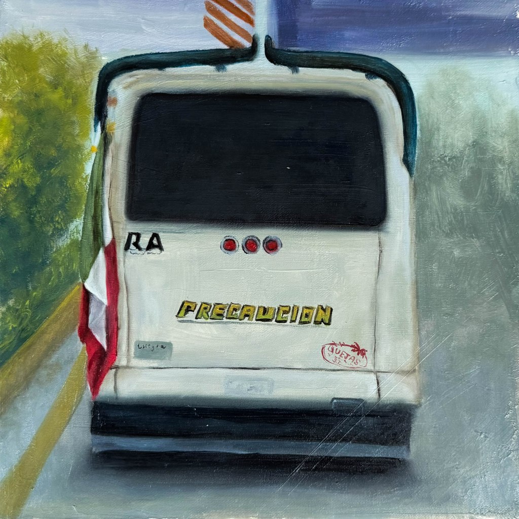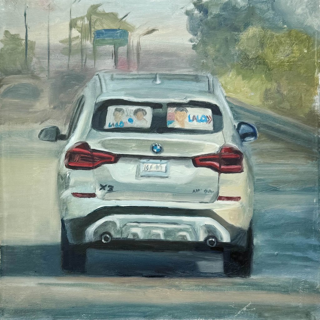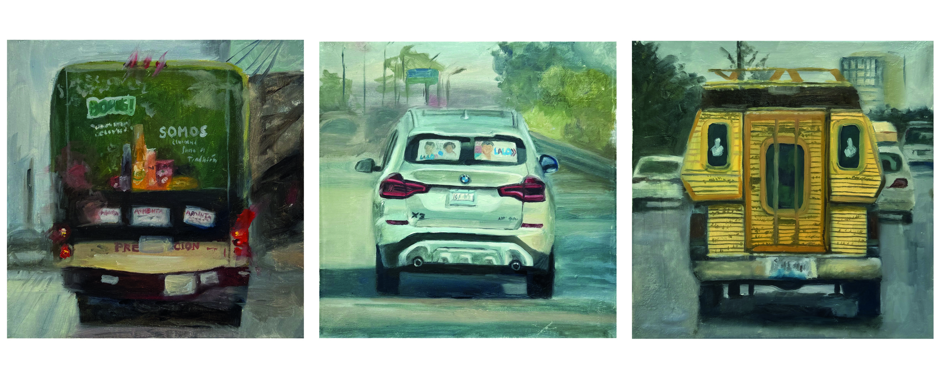 En esta serie, por el momento conformada de 9 óleos, hecha a partir de capturas tomadas en el camino cotidiano, se busca mostrar una clara diversidad de las opiniones políticas dentro del mismo territorio de Puebla en el tiempo de elecciones políticas, así como los diferentes contextos (observados en los objetos que contienen la opinión) de los que devienen estas opiniones. Estos vehículos fueron captados en diferentes días dentro de un mismo camino, el camino que se toma diario dentro del vehículo propio para ir-venir. Las pinturas, a su vez, fueron elaboradas dentro del mismo tiempo hecho en los recorridos de las respectivas imágenes capturadas, en una forma de emancipar el tiempo fuera de los “deberes” de traslado a los que nos encontramos obligados a ejercer día a día.