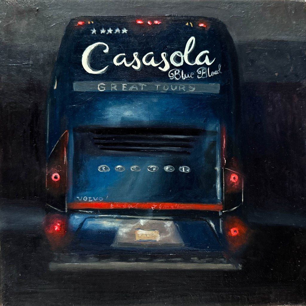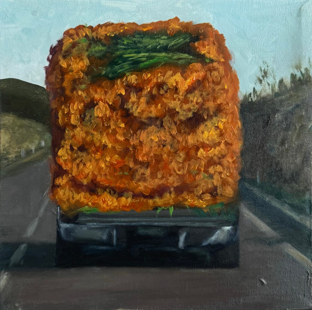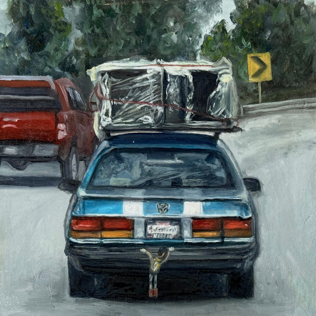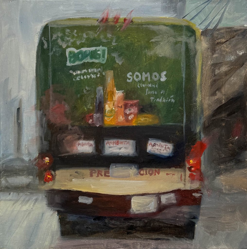 En esta serie, por el momento conformada de 9 óleos, hecha a partir de capturas tomadas en el camino cotidiano, se busca mostrar una clara diversidad de las opiniones políticas dentro del mismo territorio de Puebla en el tiempo de elecciones políticas, así como los diferentes contextos (observados en los objetos que contienen la opinión) de los que devienen estas opiniones. Estos vehículos fueron captados en diferentes días dentro de un mismo camino, el camino que se toma diario dentro del vehículo propio para ir-venir. Las pinturas, a su vez, fueron elaboradas dentro del mismo tiempo hecho en los recorridos de las respectivas imágenes capturadas, en una forma de emancipar el tiempo fuera de los “deberes” de traslado a los que nos encontramos obligados a ejercer día a día.